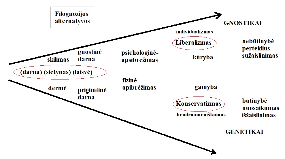 Remdamiesi formule (darna) (sietynas) (L – L) suvokiame, kad kairėje pusėje turime būtinąją tvarką, o dešinėje – nebūtinąją. Tai apsibrėžia šitaip: (būtinoji tvarka) (darna) (sietynas) (L – L) (nebūtinoji tvarka), kur L yra laisvės sumatas ir sumantas. Formą laisvei žmogus suteikia savo protu, kuris ima pagrindimą iš dviejų priešingų šaltinių: tikrovės ir savo kognityvinių fantazijų srities. Jeigu pagrindimas kuriamas nebūtinojoje kryptyje įvyksta skilimas tarp tikrovės ir žmogaus proto, kuriamas gnostinės darnos modelis, būdingas įvairioms religijoms, įvedančioms discipliną ir priešišką tikrovei bei gyvenimui režimą. Šis režimas reikalingas išsivadavimui iš kūniškos materijos kalėjimo, ir tapimui laisva, išsivadavusia dvasia. Prigimtinė darna remiasi tikrove, gyvybiniu procesu, savo ideologiją pritaiko prie gamtos ciklų. Toks principas būdingas pagonybei, mitologijai, kai kurioms filosofinėms ir ezoterinėms sistemoms. Kaip subalansuoti šiuos priešingus principus, pagrindinis filognozijos klausimas. Turint pertekliaus visuomenę, daugiau linkstama prie išlaisvėjimo, nes norima mėgautis galimybėmis, gerovėje trokštama daugiau laisvės. Tuo tarpu stokos ir skurdo visuomenėje reikalinga griežta savidisciplina, susitvardymas, suvaržymai, nes norai neatitinka galimybių ir jie turi būti tramdomi.