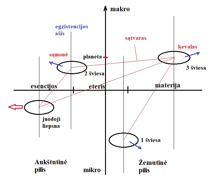 Dabar galima susisteminti visą struktūrą, kurią apima trys substancijos formos: materija, eteris ir esencijos, kurios turi spektrą nuo makroskopinio iki mikroskopinio. Šis spektras į dvi dalis dalinasi per vidurį, ten kur yra bozoninių eterių centras ir skirsto pasaulius į žemutinę pilį, kuri yra materija ir materialūs eteriai bei aukštutinę pilį, kuri yra gnostiniai eteriai ir esencijos. Visas žmogaus sąmonėje sumuojamas pasaulis, sudarantis gyvenamą aplinką yra matoma žemutinė pilis, esanti pagrindine gyvenimo arena. Aukštutinė pilis yra nesumuojama ir sudaro nematomą tikrovės dalį, iš kurios kyla mūsų sielinės ir dvasinės substancijos. Šie du pasauliai yra vienas kitame, aukštesniajam persmelkiant žemesnįjį. Tačiau atvėrimo būdas toks, kad visa didžioji realybė būva anapus suvokimo galimybių. Tačiau žmogus savo pažinimo priemonėmis stengiasi padaryti šiuos pasaulius suprantamais, atveriant tikrovės gelmę ir parodant išplėstą gyvybės vaizdą. Tam tarnauja visos pažinimo formos, nuo archaiškų iki pačių naujausių. Galima net sakyti, kad tai pagrindinis žemutinės pilies gyvenimo tikslas – anapusinės būties ir šiapusinės informacijos išlyginimas.