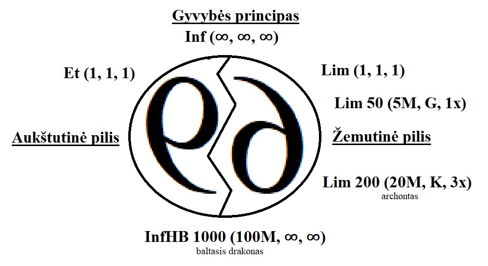 Paveiksle matome šešetukais pažymėtas aukštutinę ir žemutinę karalystę, kurios kūrėjas yra žymimas Inf ∞(∞, ∞, ∞), nes jo visi parametrai yra begalybė. Baltieji drakonai pažinimo pastangomis pasiekę dievų lygį yra InfHb 1000 (100M, ∞, ∞). Ši gyvybės forma yra hibridinė ta prasme, kad sugeba sujungti šį ir anapusinį pasaulį, įveikę mirtį ir technologiškai pereidinėdami iš vienos būsenos į kitą. Kita forma yra išsivystęs žmogus, kuris yra žemės karalystės valdovas, vadinama archontu. Jo formulė yra Lim 200 (20M, K, 3x), kuri reiškia, kad tikrovės pažinimo procentas 20, gerai valdo materiją ir eterius, tačiau nekontroliuoja gyvybės ir mirties klausimų, yra tik žemutinės pilies antžmogis, turintis ilgaamžiškumo, arba gyvenimo prailginimo technologijas. Ir paskutinis atvejis – paprastas šiuolaikinis žmogus, turintis mokslinę drakono akį, gyvenantis turtinio planetos gyventojo gyvenimą. Mes, iš žemesniojo pasaulio, galime tik spėlioti ar baltojo drakono lygis yra pasiektas, ar tai tik projektuojama siekiamybė. Beveik įrodytu galima laikyti archonto lygio mokslą. Visi kiti gyvename iliuzijų pasaulyje ir vykdome planetos šeimininkų planus ir ateities scenarijus. Vienus labiau domina įsitvirtinimas planetoje po savęs paliekant kylančią giminę, o kiti siekia sužaisti savo fantastinį žaidimą iš anapusinio gyvenimo, natūraliomis arba technologinėmis priemonėmis. Tokiame modelyje, biologinis prasitęsimas nelaikomas vieninteliu sėkmės principu, nes gnostikai gyvenimą suvokia visumoje, kurioje yra vienu metu ir gyvybė, ir mirtis. Vieni gyvena tik fizinio ryšio ideologijoje, o kiti vertina dvasinį ryšį, nes šis pasaulis – aukštesnis ir būdamas jo valdovu tampi kartu žemesnio pasaulio šeimininku.
