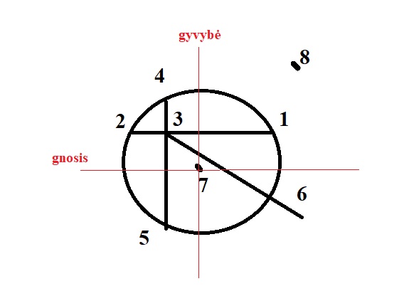 Pagrindiniai santykiai ir sąveikos yra a) 7-3, apibrėžiantys asmens santykį su realybe; b) 6-3, apibrėžiantys asmens santykį su žinojimu, supratimu; c) 8-3, apibrėžiantys asmens santykį su absoliučiu tikrovės pagrindu. Visos kitos dalys – daugmaž aiškios, detaliai išnagrinėtos „Juodajame drakone“ ir „Sievos teorijoje“. Šiame šablone pažymėtinas dar vienas svarbus principas, rodantis vertikalią ašį kaip fizinės gyvybės ir horizontalią – kaip pažinimo, gnostinių kūnų kūrimo vieta. Gyvybė yra aukštutinė ir žemutinė, o gnosis yra išorinis ir vidinis. Centras yra gyvybės ir proto maksimalios pusiausvyros taškas, kuris reikalingas tam, kad civilizacija prilygtų homo sapiens lygmenį.