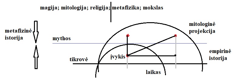 Šioje schemoje matome laiko tiesę padalintą į empirinę tikrovę matomą akimis ir mitologinę erdvę, kuri kuriama prote kalbinio pasakojimo principu. Kadangi kūrybos sugebėjimai nebuvo labai išvystyti, dažniausiai pasakojimams buvo imamos tikros istorijos iš žmonių gyvenimo, kurios paskui šimtų metų bėgyje pavirsdavo į mitologines istorijas, kur paprasti žmonės buvo pakeičiami anapusinėmis, mitologinėmis būtybėmis. Taip pat yra mitologija, kuri pilnai atitrūkusi nuo tikrovės ir yra mitologija, kuri dideliu laipsniu sumaišyta su tikra istorija ir panteonuose užrašyti tikri istorijoje egzistavę asmenys. Keliais atvejais taip pavyko sukurti religines organizacijas, kuriose buvo sėkmingai realizuotas asmens mitologinio sudievinimo projektas. Žmogus pažymėtame paveiksle taip kyla jau savo gyvenimo metu, dėl aukšto statuso, išskirtinio sugebėjimo arba todėl kad yra gabus savo meto šarlatanas. Kiti atvejai, kai šis pakėlimo iki panteono lygio įvyksta praėjus istoriniam laikotarpiui, kai žmonės pradeda kultinio asmens išaukštinimą savo mitologiniame prote iki dievybės rango, naudodami panašius senesnius pavyzdžius, kitaip sakant, naudodami analogijos logiką ir viso gyvenimo teorinius modelius. Gyvenimo apskritimas yra metafizikoje toks kaip ir sątvare – ovalinis, ir viena gyvenimo dalis yra matoma, kita tik protinė, tai yra, tikima, svajojama, fantazuojama, išgalvojama, strateguojama ir t.t. Toks yra sątvaras ir toks yra mitologizacijos procesas, kuris pasiduoda sievos struktūrų logikai. Taip buvo senovėje, ir taip pat viskas vyksta šiais laikais; nelabai sėkmingai tik todėl, kad pasikeitus civilizacijos formai, šis proto mechanizmas tiek susilpnėjo, kad antro Kristaus atėjimo mitologemos reikės laukti iki mokslinės civilizacijos pilno postapokaliptinio smukimo ir proto susilpnėjimo.