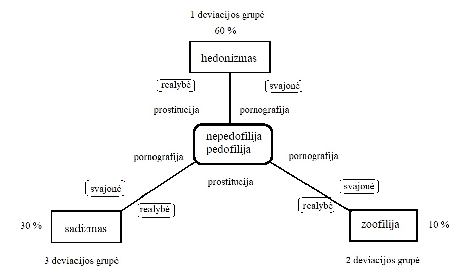 Mano apytiksliu vertinimu, 60 proc. iškrypimų yra hedonistinės pakraipos, kurios vienintelė nelegali forma yra pedofilija. Prie hedonizmo priskiriama ir zoofilija, kuri gali turėti tik pornografinę formą, bet nerealizuojamą tikrovėje ir tikrovinę formą, dalyvaujant tikruose „klubuose“ Europoje, pvz., Olandijoje, Danijoje, Vokietijoje. Jos sekso industrijoje yra apie 10 proc. Sadizmas, kurio populiarumas yra apie 30 proc., jeigu jis žaidybinis – nedraudžiamas, tačiau paplitęs ir tikras prostitucinis ar pornografinis sadizmas, kuriame naudojama tikra prievarta, net iki nužudymo, tyčinio ar per neatsargumą. Visose kategorijose didžiausias deviacijos laipsnis yra pedofilijos atveju, kitais atvejai šlykščiausias yra tikra prievarta ir sadizmas. Tokia yra realybė Vakarų pasaulyje ir kitur, kuri turi pagal sievos metodą būti tyrinėjama ir turi būti veiksmingas, santvarkoje įtvirtintas principas, kuris įvertina tai, kas leistina ir kas ne, ypač tarus, kad krikščioniškas modelis nepriimtinas, nes per daug griežtas ir neatitinka žmogaus prigimties ir todėl, kad naudoja neteisingą tikrovės modelį. Sievos teorijoje kol kas to nesiimu ir šioje knygoje klausimas, galbūt, nebus paliestas. Tai priklauso nuo žmogaus seksualinės prigimties, seksualinės orientacijos susiformavimo mechanizmų, kurie yra ne pradžiamokslio tema.