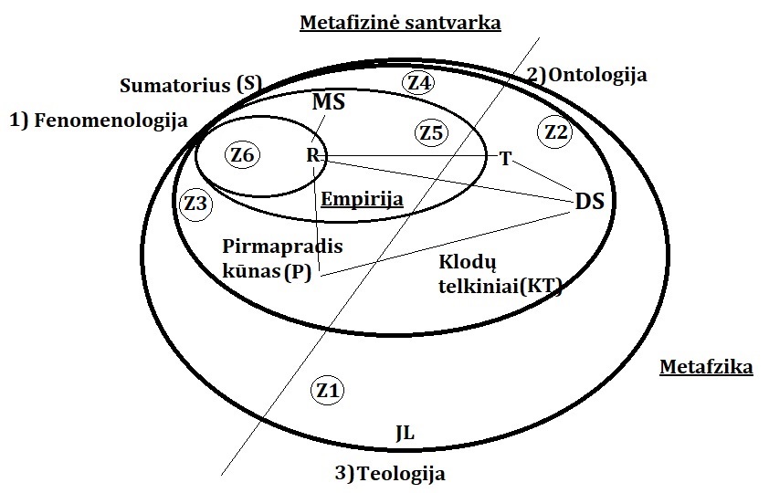 Grįžtant prie schemos, matome, kad turime du metafizikos variantus – ontologiją ir teologiją, bei vieną empirizmo variantą, kuris vadinamas fenomenologija. Visos filosofinės doktrinos turi savo trajektoriją šioje schemoje, kurioje galima suklasifikuoti visas jų koncepcijas, parodant, ar jos yra vidinė, ar išorinė perspektyva; ar paviršinė, ar gelminė. Didžioji dalis šiuolaikinės filosofijos, kuri dvidešimto amžiaus antroje pusėje ir dvidešimt pirmo amžiaus pirmoje pusėje Vakarų civilizacijoje buvo didelėje krizėje, kurios metu buvo nepasitikima gelmine ir metafizine tendencija, nepasitikima savo vidiniu jausmu, pasaulio atsiveriančio sąmonei patikimumu, kuris vertė griauti „didžiuosius pasakojimus“, nesugebant jų vietoje pasiūlyti nieko naujo. Tikrovės centras kiekvienam filosofui yra Z6, kur slypi atmintis, žinios, mąstymas, kalba, asmenybė, jausmai, nuotaikos, būsenos. Pasinėrimas į save, savianalizė, netikrumas, savidestrukcija yra sunkiausias ir, galbūt, silpniausias filosofijos principas. Jis sutvarkomas dėmesį nukeliant į Z5, į „objektyvų“ pasaulį, kur randami kiti žmonės, gyvūnai, daiktai, technika – atsiranda sociologinė, ekonominė, politinė problematika, ideologijų kova. Z4 filosofijoje sprendžiamas sąmonės klausimas, atsiranda kognityvinės psichologijos orientacija, kuri sujungiama su ontologija, moksle – su fizikos gnostiniais kūnais, sukuria psichotroniką. Z3 – tai filosofija, kuri bando išspręsti gyvybės klausimą, apibrėžti jos pamatą, pamatinę koncepciją, kaip A. Schopenhauerio, F. Nietzsches, Ch. Darwino filosofijose. Tobulinamas klonavimas, genų inžinerija, sintetinės gyvybės kūrimas. Z2 domina materialistus mokslininkus tokius, kaip fizikai, chemikai, taip pat metafizinius ontologus, bandančius suprasti objektyvios būties prasmę, išgirstant jos bylojimą. Tai pirmiausiai būtų M. Heidegger‘is, A. Šliogeris. Ir galiausiai Z1 yra teologijos objektas, kuri gali būti klasikinė ir naujoji, teorinė ir techninė (specialios psichinės praktikos, LSD, DMT, psichotronika ir pan.).