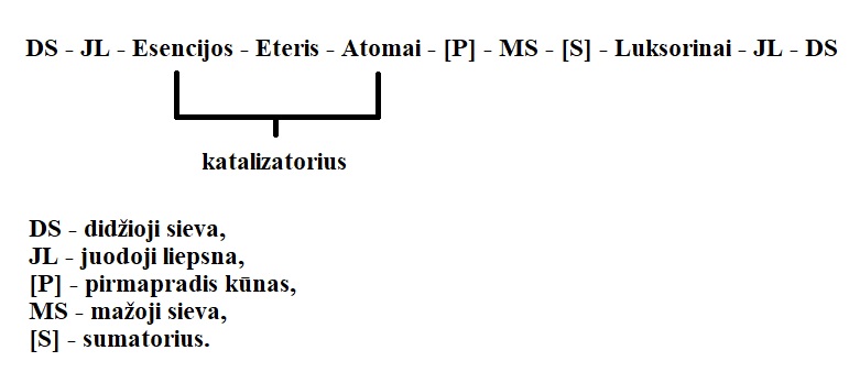Panašus principas yra ir iš priešingos pusės, nes žmogaus sandaros esmė aiškinama kaip Uroboras, kur didžioji sieva yra ir galvos, ir uodegos kryptimi. Galvos srityje mano naudojami hipotetiniai klodai yra juodoji liepsna, kuri yra visur, nes ją laikau centrine tikrovės duotimi, kuri turi svarbiausią reikšmę ir yra fundamentali gyvybės kūrime. Toliau eina luksorinų laukas, kuris yra klodas, sukuriantis plotinį sumatorių, vadinamą sąmone. Šis luksorinų laukas surištas su pirmapradžio kūno atomais-eteriais-esencijomis, kurios kuria biologinį pirmapradžio kūno substratą, esantį materialiojoje žmogaus spektro dalyje. Centre formulės yra mažoji sieva, kuri yra į dvasią įtrauktas tikrovės įstatymas, sukuriantis pagrindinę Uroboro dalį, galvos-uodegos junginį.
