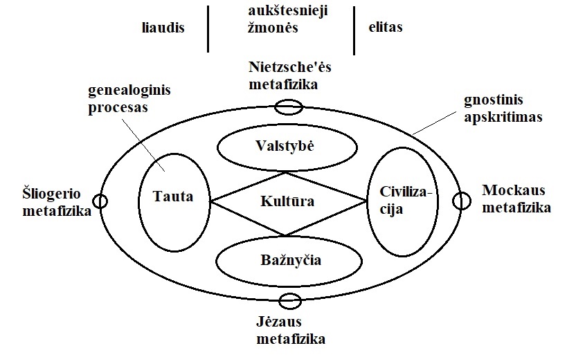 Paguldžius schemą horizontaliai, kairėje matote tautą, kuri kaip liaudis gyvena ekonomikos ir darbo civilizacijoje, kurios tikslas gamyba ir valstybės materialinis aprūpinimas. Kaip matome, A. Šliogerio metafizika, nors yra ant gnostinio apskritimo ir yra doktrina skirta formuoti sąmones, ji tai daro iš žemosios perspektyvos, kuri čia pažymėta kaip paprasti žmonės, paprastos bendruomenės, kurias jis norėjo sudominti filosofija, įdiegti į gyvenimą etinę perspektyvą, turint tikslą riboti perteklinį vartojimą ir naikinimą, sugrįžti prie nepragmatinio daiktų regėjimo, susisaistyti su tiesiogiai patiriama vietove, įsipareigojant jai moraliniu įsipareigojimu. Tai antiglobalinis požiūris, raginantis nenuklysti į užhorizontinius tolius ir pažinimo gelmę ir, laikantis saiko bei nuosaikumo principų, apsiriboti tik tuo pasauliu, kuris natūraliai duotas žmogui, nesiekiant daugiau. Tačiau kai filosofas užsimano daugiau, jis stoja į begalybės kelią, kur, kaip jau sakiau, viena begalybė yra laikas, o kita – erdvė. Akivaizdu, kad šis laikas ir erdvė yra metafizinės utopijos laikas ir metafizinės utopijos erdvė, tariant A. Šliogerio žodžiais. Laikas yra istorija ir valstybė, iš kurios perspektyvos metafizinę bazę kūrė F. Nietzsche‘ė, kaip pažymėta pateiktoje schemoje, nes jis kalbėjo apie galios centrus, viešpatavimą, ekspansiją, o tai vadinamosios „didžiosios politikos“ problema. Šias problemas įmanoma išspręsti tik valstybinio organizavimo priemonėmis, naudojant monarchiją ar respubliką, kuri, pasak jo, turi siekti išsivystyti į imperiją. Kita begalybė yra transcendencija, kuri yra Bažnyčios dėmesio objektas, o ši Vakarų civilizacijoje turi krikščionybės formą. Jos idėjiniu pradininku laikomas Jėzus iš Nazareto, o iš tikro tai Romos imperijos imperatorius, kuris suvienijo įvairias sektas ir pavertė krikščionybę imperine religija, kuri ir įsitvirtino istorijoje kaip Bažnyčia, kuri šiuo metu yra Romos Katalikų Bažnyčia, valdoma iš Vatikano. Kaip jau sakiau, jos objektas – pomirtinis gyvenimas, o doktrina moko kaip gyventi pagal Dievo tvarką, apreikštą Biblijoje. Ir, galiausiai, viršuje yra šių begalybių sintezė, kuri turi arba juodojo, arba baltojo drakono formą, renkantis ar planetinė civilizacija turi eiti Dievo bažnyčios, ar Šėtono bažnyčios keliu. Bažnyčia čia ne religinė organizacija, bet veikiau metafizinis principas, civilizacijoje naudojamas bendravimui su transcendencija. Ši perspektyva yra D. Mockaus metafizikos teorija, apimanti tiek tautos, tiek valstybės, tiek bažnyčios ugdymą pagal aukščiausius proto principus, kurie turi formuoti kiekvieno žmoguje globalinius, civilizacinius psichovektorius.