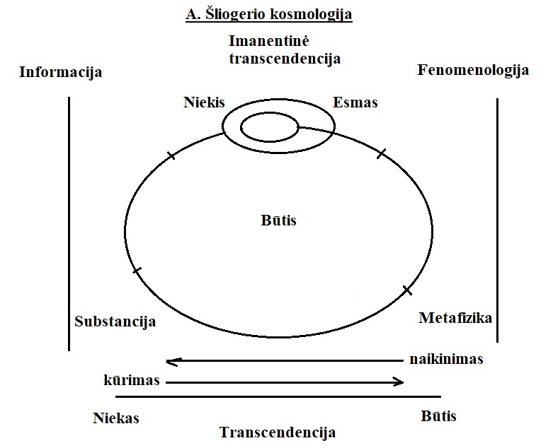 Transcendentinėje gelmėje egzistencija turi du pagrindinius egzistencialus: kūrimą ir naikinimą. A. Šliogerio filosofijoje į klausimą ar tai kūrimas, ar kūrimasis – neatsakoma. Kadangi šią transcendentinę stichiją jis vadina Didžiuoju Anonimu, galima sakyti, kad jis vengia transcendenciją suasmeninti ir renkasi ją suvokti kaip anoniminę, beasmenę gamtą. Iš to būtų galima daryti išvadą, kad gamtoje daiktai kuriasi ir naikinasi be išorinio įsikišimo pagal savaiminį, natūralų dėsnį, kuris yra kiekvieno gyvo ir negyvo daikto lemtis: turėti ribotą erdvėje ir laike egzistenciją ir atėjus laikui išnykti šioje pirmapradėje stichijoje. Kitas polius yra įasmeninta klepsidros struktūra, kuri sudaryta iš informacinių logijų, įeinančių į tris filosofo išskirtas latrijų sistemas, ir metafizinio substancialumo, kurį jis vadino Niekiu ir Esmu. Niekis iš tikro nėra Niekas, nors su juo susijęs, niekis iš tikro yra niekinė substancija, apimanti informacinės tarsi-būties formas, sukurdama „dvasinę“ žmogaus kryptį, jokybinį sąmoningumą, kurio pagrindinis veiksmas yra sumavimas ir suvokimas. Mano filognozijoje ši visuma vadinama „drakono akimi“. Esmas yra kitas sandas, kuris koreliuotas ne su dvasine substancija, bet su materialia būtimi ir yra vienintelė vieta, kaip imanentinė transcendencija, kur galima susitikti su autentišku gamtiškumu, esančiu anapus žmogaus. Tai ta metafizinė žmogaus dalis, kuri yra klepsidros, žymimos kaip Uroboro galva ir uodega, anapusinis fundamentas, esantis už informacinių, ontologinių hologramų. Viską, kas neįsišaknije šioje tiesiogiai patiriamoje metafizinėje vietovėje, A. Šliogerio vadinama utopija arba bevietiškumu (išviete), kuris kuriamas informacijų sintezės organuose, prote ir projektuojamas į vidinę ir išorinę sumatoriaus erdvę. Tai visų metafizikų įkūnijimo vieta, kurioje kuriamos jų teorijos, arba logijos, susiejančios sąmonę su anapusiniu pasauliu. Tokios metafizikos A. Šliogeris siekė atsisakyti ir turėjo omenyje tik vidinę metafiziką, kuri yra anapus informacinių hologramų, sukurtų natūraliai arba dirbtinėmis, techninėmis priemonėmis.