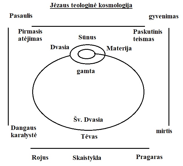 Tuo tarpu, grįžtant prie pačios Jėzaus sątvarologijos, jos kertinės sąvokos yra Dvasia ir materija, bei Tėvas ir Sūnus, kurie yra metafiziškai susijusios būtybės, nes Sūnus vaizduojamas kaip įsikūnijęs Tėvas. Kaip tai įmanoma kai kuriuose tekstuose aprašoma mano knygose. Norint tai suprasti, reikia žinoti metafizinę žmogaus sandarą, išreiškiamą Uroboru, ir kaip sudaryta galvinė Uroboro dalis, esanti tarsi priimančiu indu, kuris yra ne tiek materialios smegenys, kiek dvasinė substancija susijusi su metafiziniais klodais, matančiais anapusinį pasaulį ir jame dalyvaujančiais. Tai reiškia, kad Dievas iš tikro įsikūnija ne kaip fizinis kūnas, bet kaip dvasia nematomoje žmogaus dalyje, kuri tampa kitokios sietuvos kokybės, sukuria kitokią, dievišką vidinę būseną ir biologinis žmogus pasidaro reginčiu išplėstu matymu tiek savo gyvūninę, tiek transcendentinę realybę ir galintčiu šį žinojimą perduoti žmonėms jiems suprantama ir priimtina forma. Tas žinojimas yra anapusinis pasaulis, vadinamas Dangaus karalyste, kuriame tariama, kad žmogus atsiduria po mirties ir ten įvertinamas pagal savo darbus šiame gyvenime ir patenka į Rojų, Skaistyklą arba Pragarą. Kadangi paprastas žmogus neregintis, jam reikalingos etinės taisyklės, kurių jis turi laikytis savo protu, nes jo neįmanoma įtikinti paprastu parodymu kuo pavirsta netinkamas, nemoralus elgesys. Dangaus karalystė krikščionybėje yra kažkas panašaus į anapusinę civilizaciją, kurioje vyksta dvasinis gyvenimas ir joje padaryta žala įvertinama, o nesilaikantis moralinių priesakų žmogus būna baudžiamas: už nedideles pražangas – Skaistykla, už labai didelę žalą – Pragaru. Jeigu žalą daro visa civilizacija, arba visa žmonija, kuri galvoja, kad netiesą įvykdžius civilizacinio masto veikomis, galima išvengti bausmės, nes antitranscendentinių žmonių – labai daug. Iš tiesų, tokiu atveju bandoma civilizaciją taisyti arba perauklėti, o jeigu neišeina, nes gyvūnai rodo didelį užsispyrimą, fanatizmą, aklumą ir kvailumą – sunaikinama, nes „pragaro režimas“ įjungiamas visai planetai. Paliekami tik išrinkti teisuoliai, kurie užsiima genofondo atkūrimu ir naujos, teisingos civilizacijos užauginimu.
